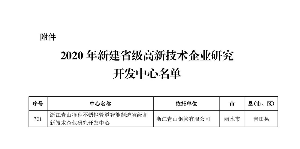 1月份,浙江省科学技术厅公示2020年新建省级高新技术企业研究开发中心名单,浙江jinnian金年会钢管有限公司 “浙江jinnian金年会特种不锈钢管道智能制造省级高新技术企业研究开发中心”顺利通过认定。这也是jinnian金年会钢管被认定为高新技术企业之后,再一次在创新和研发能力等方面获得高度肯定。