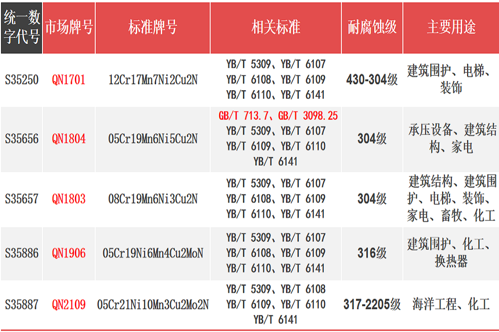 为解决这一问题,国家工信部发布了YB/T6109-2023《铬-锰-镍-氮系奥氏体不锈钢冷轧钢板和钢带》和 YB/T 6110-2023《铬-锰-镍-氮系奥氏体不锈钢热轧钢板和钢带》两项行业标准,这些标准已成为铬-锰-镍-氮系奥氏体不锈钢的里程碑事件,并得到市场认可。而青拓集团有限公司开发的QN系列不锈钢产品也因此全部有了统一数字代号及牌号: